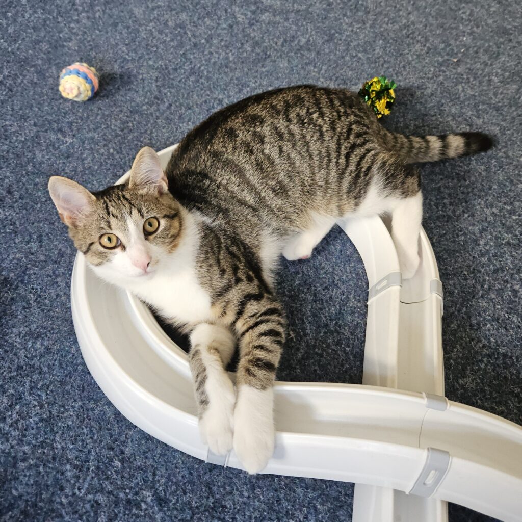 Špuntíka jsme k nám přijali se sourozenci od bezprizorní kočičky (ta je dnes již vykastrována) z Radostína. Špuntík je naprostý pohodář, uvrněný a umazlený miláček, který se s vámi skamarádí okamžitě. Je to ideální kocourek k někomu, kdo chce velkého mazlíka, kterému se bude hodně věnovat. Je to hravý a aktivní kocourek, života si užívá se všemi radostmi. Domov hledá s kočičím parťákem, jako jedináček určitě ne, pouze do bytových podmínek, se zasíťovanými okny/balkonem, s kvalitní péčí a kočičím zázemím.