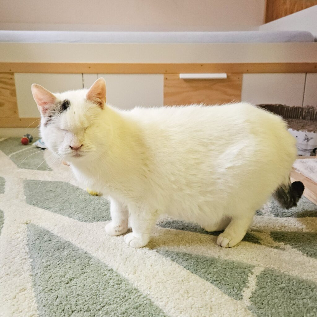 Tonička pochází z Vojnova Městce, z kauzy, která hraničila s týráním. Osmnáct koček žilo zavřených v hrozných podmínkách v domě s majitelkou, bez záchůdků, zablešení, hubení, nemocní. Po její smrti byly vyhozeny ven, kde začaly vadit sousedům. Někdo na ně střílel, řada z nich má v sobě diabolky. Z osmnácti přežilo osm, které jsme vzali k nám. Tonička na tom byla naprosto nejhůře. Kostřička potažená kůží, s krvavou rýmou, shnilými zoubky, jedním okem vystřeleným, na druhé ani neviděla, obě bylo tedy nutné řešit chirurgicky, aby ji neprovázely další bolesti a potíže. Trvalo nějakou chvíli, než se ze všeho dostala. Dnes je to úžasná kočičí holka. Miluje lidi, chodí za každým jako ten nejvěrnější pejsek. Největší radost má z hozené myšky nebo míčku, dokáže si se vším vyhrát hodiny s takovou radostí a spokojeností, až je to dojemné. Moc ráda papá, po letech strádání si teď dobré jídlo umí náležitě užívat. Toničce hledáme domov výlučně v bytových podmínkách, se zasíťovanými okny a balkonem, musí mít doma naprosto bezpečno a tu nejlepší péči. Má kolem sebe moc ráda společnost kočiček, se všema vychází krásně, proto určitě nebude šťastná jako jedináček. Je nutné počítat s tím, že má Tonička problém s používáním záchůdku, často chodí všude okolo, což v útulku řešíme na jejich oblíbených místech podložkami, je to tedy v jejím případě jeden z pravidelných nemalých výdajů.